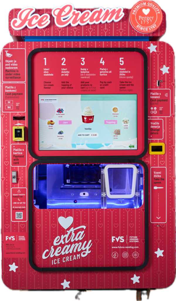 Sladolednega robota poganjajo izključno robotske inovacije, ki popolnoma odpravljajo potrebo po človeškem operaterju. Stroj le napolnite z materiali, ko je to potrebno. Ves čas ste lahko brez skrbi, medtem ko vaš nov robotski pomočnik generira odlično prodajo in zagotavlja ekspresno hitro povrnitev naložbe.
